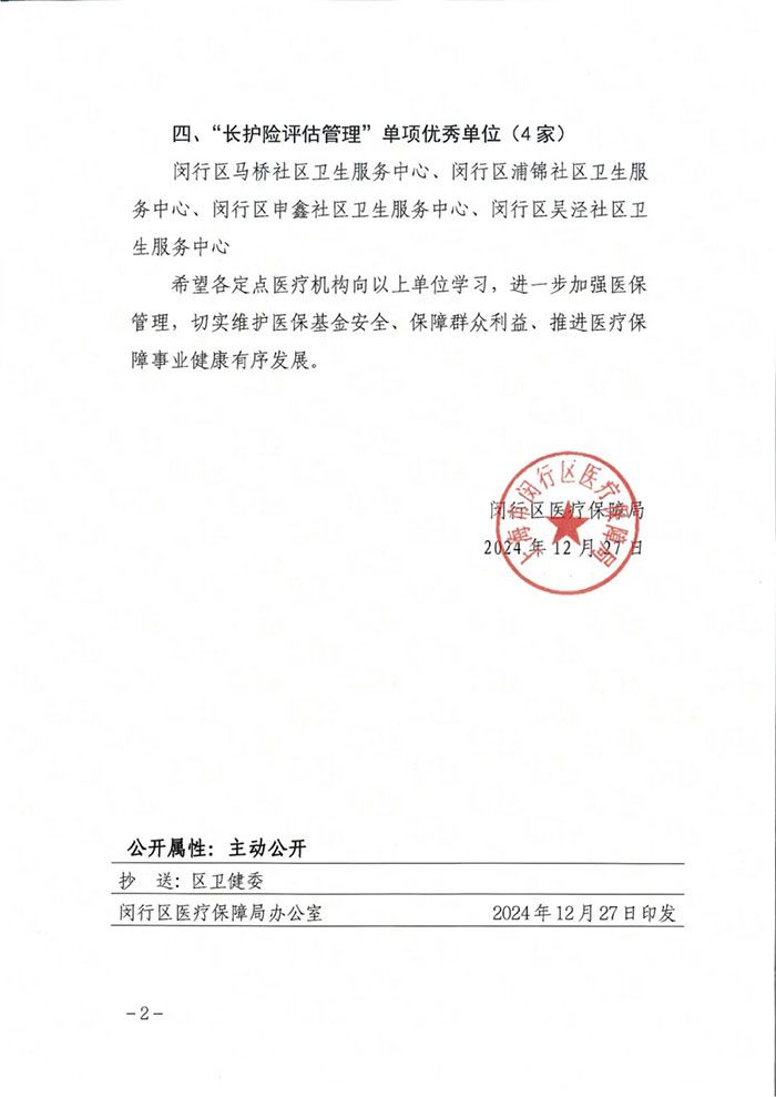 根據(jù)閔行區(qū)醫(yī)療保障局《關(guān)于表彰 2024年度醫(yī)保管理優(yōu)秀單位的通知》(閔醫(yī)保發(fā)【2024】13號),區(qū)醫(yī)保局根據(jù)醫(yī)保工作目標(biāo)考核要求,對閔行區(qū)23家公立醫(yī)療機構(gòu)和39家社會辦醫(yī)療機構(gòu)的醫(yī)保管理工作進(jìn)行了考評,結(jié)合日常醫(yī)保管理開展情況,最終評選出2024年度醫(yī)保工作優(yōu)秀單位。
