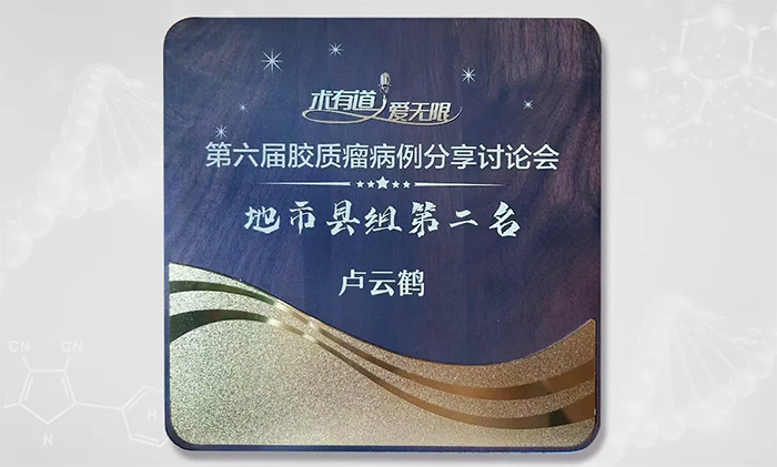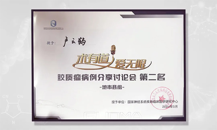 會(huì)上,盧云鶴博士還獲得了國家神經(jīng)系統(tǒng)疾病臨床醫(yī)學(xué)研究中心授予的膠質(zhì)瘤病例分享討論會(huì)第二名(地市縣組)獎(jiǎng)牌。