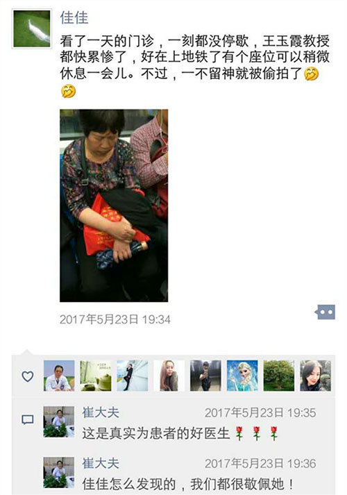 5月23日,羅佳忍不住發(fā)了一條朋友圈:看了一天的門診,一刻都沒有停歇,王玉霞累慘了......“那天如往常一樣,病人特別多,她忙到7點多,回家在地鐵上累睡著了。”羅佳至今印象深刻。“她住在靜安寺,每次來出診,要花費一個多小時,但她總是提前半個小時到,趕在出門診前去病房看看門診收過的病人,門診結束后再去一次,雷打不動。”