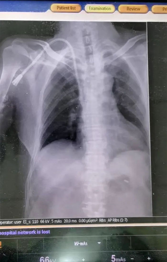 情況緊急,必須盡快為患者重新構(gòu)建一條長(zhǎng)期透析血管通路。為拯救患者,經(jīng)醫(yī)護(hù)團(tuán)隊(duì)反復(fù)討論,與患者家屬充分溝通病情后,決定為患者行右鎖骨下靜脈長(zhǎng)期導(dǎo)管置入術(shù)。在張慶成主任、李向明醫(yī)生及醫(yī)護(hù)團(tuán)隊(duì)通力協(xié)作下,最終成功為該患者建立“生命通道”,架起生命橋梁。再經(jīng)過DR驗(yàn)證,導(dǎo)管已經(jīng)到達(dá)指定部位,未出現(xiàn)出血等相關(guān)并發(fā)癥及靜脈阻塞癥狀,術(shù)后導(dǎo)管引血通暢,血液透析、輸血順利進(jìn)行。