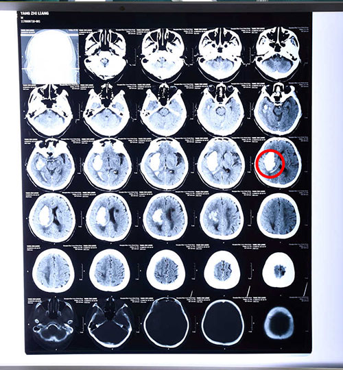 病人術(shù)前顱腦CT影像資料,紅圈內(nèi)白色陰影區(qū)為出血部位