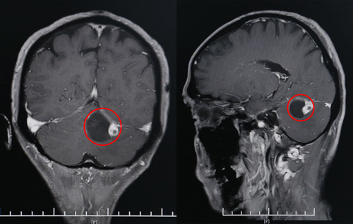 CT影像顯示,患者左側(cè)小腦囊實性占位(紅圈部分)