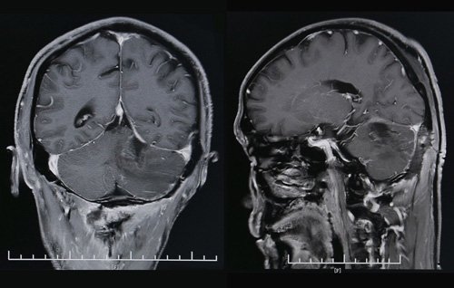 這臺難度較高的手術由神經(jīng)外科主任沈建康教授親自操刀。從切開頭皮到止血縫合,總共歷時約4小時。“手術的關鍵是找到和完整切除血管性腫瘤。”沈建康教授解釋道,囊腫被穿刺后囊液流出,癟下去的囊腫就會使血管性腫瘤“隱身”于周圍腦組織中,若不加以徹底摘除,仍具有危害性。這對于手術醫(yī)師的技術和經(jīng)驗是極大的考驗。