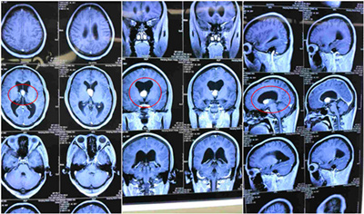 患者于2016年9月,在安靜狀態(tài)下無明顯誘因,出現(xiàn)頭暈頭脹,后自行緩解;12月份患者在無明顯誘因下出現(xiàn)精神狂躁,情緒激動(dòng),神志恍惚,頭部CT示:兩側(cè)側(cè)腦室前角及第三腦室前部區(qū)域占位,伴滲出,幕上腦室積水。曾于多家知名醫(yī)院尋求手術(shù)治療未果,2017年1月13日慕名來到上海藍(lán)十字腦科醫(yī)院,門診以“顱內(nèi)占位,腦積水”收住入院。
