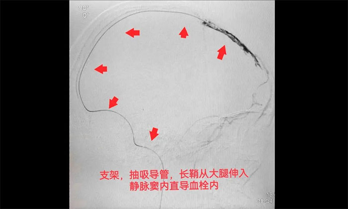 神經(jīng)內(nèi)科4B病區(qū)主任吳勝軍結(jié)合患者病情和影像資料,考慮為顱內(nèi)靜脈竇血栓,并邀請(qǐng)醫(yī)院學(xué)術(shù)副院長(zhǎng)、神經(jīng)內(nèi)科4A病區(qū)主任席剛明教授會(huì)診。綜合分析后,席剛明教授指出:患者重型顱內(nèi)靜脈竇血栓形成,由于存在靜脈回流障礙,已經(jīng)導(dǎo)致左側(cè)額葉靜脈性腦梗死、顱內(nèi)壓增高,而且患者病情進(jìn)展快,患者之前使用抗凝治療效果不佳,癥狀逐漸加重,時(shí)間刻不容緩,應(yīng)該立即行介入手術(shù),打通靜脈竇,緩解顱內(nèi)壓,及時(shí)挽救患者生命。