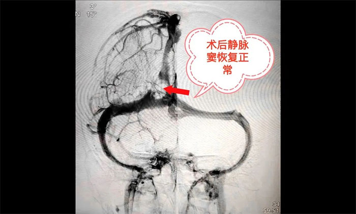 術(shù)中,席剛明教授在4A病區(qū)副主任王貴平博士協(xié)助下,憑借二十多的介入手術(shù)經(jīng)驗(yàn)小心探索,一邊“疏通”,一邊不斷切換正位及側(cè)位造影,避免造成其他損傷。經(jīng)過(guò)3個(gè)多小時(shí)的奮戰(zhàn),經(jīng)多次支架取栓、導(dǎo)管抽吸,取出大量暗紅色血栓,復(fù)查造影見(jiàn)上矢狀竇、竇匯、右側(cè)橫竇、乙狀竇顯影改善,患者靜脈竇順利再通。術(shù)后,患者癥狀好轉(zhuǎn),癲癇未再發(fā)作,頭痛惡心等癥狀消失,最終脫離了生命危險(xiǎn),逐步恢復(fù)健康。
