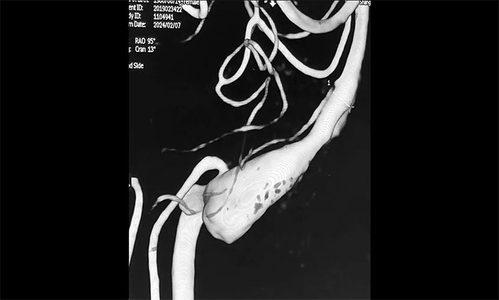 席剛明教授團隊為患者進行了DSA全腦血管造影檢查。DSA檢查確診:右側(cè)椎動脈V4段大型梭形動脈瘤、串聯(lián)多發(fā)動脈瘤(多發(fā)夾層動脈瘤),遠端大動脈瘤的瘤頸 6mm,瘤體13 mm* 15 mm,累及右側(cè)小腦后下動脈,屬于大型復雜動脈瘤,近端小動脈瘤的直徑約4mm。席剛明教授、王貴平博士會診認為,該患者的動脈瘤有較高破裂風險,若未得到及時救治,可能導致蛛網(wǎng)膜下腔出血、腦干受壓、腦梗死甚至死亡等一系列不良后果,手術(shù)指征明確。