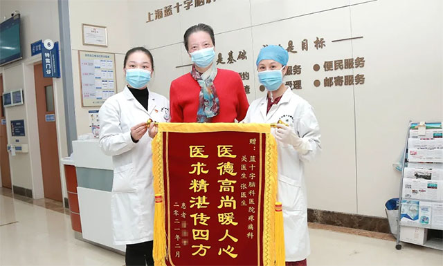 2月26日元宵節(jié)當(dāng)天,68歲的喬阿姨(化名)在上海藍(lán)十字腦科醫(yī)院疼痛科接受治療后,感激萬(wàn)分地說(shuō)道。同時(shí),她和家人一起,為關(guān)桂春教授和治療師張?zhí)账蜕狭?ldquo;醫(yī)德高尚暖人心 醫(yī)術(shù)精湛傳四方”的錦旗,表達(dá)最誠(chéng)摯的謝意。