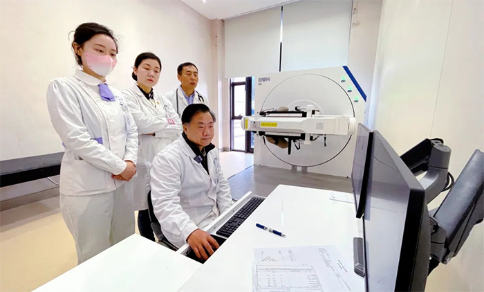 ▲ 席剛明教授在操作眩暈癥診療儀,為患者檢查治療