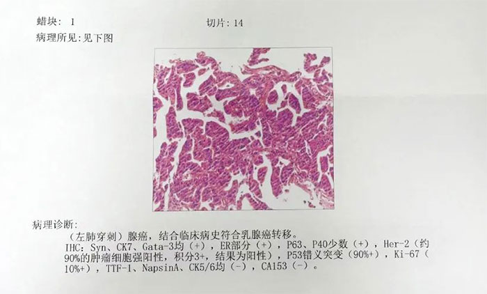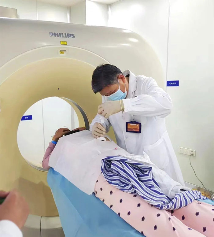 在明確告知風險并經家屬同意后,張澤明主任在CT引導下精準定位,選擇合適的進針位置,一次穿刺成功,順利取得組織樣本。手術過程順利,未出現(xiàn)明顯并發(fā)癥。經送檢,術后病理診斷為腺癌,結合臨床病史符合乳腺癌轉移,為制定下一步個體化綜合治療方案提供了重要依據(jù)。