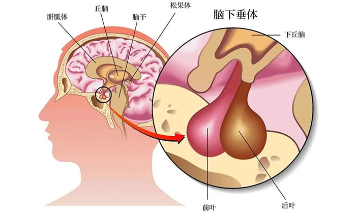 垂體是內(nèi)分泌系統(tǒng)的主要控制者,位于大腦底部蝶骨上馬鞍形的小窩內(nèi),僅有豌豆大小,負(fù)責(zé)控制人體內(nèi)總體激素的平衡。垂體附著在下丘腦上,下丘腦是大腦的功能部分,又控制著垂體。