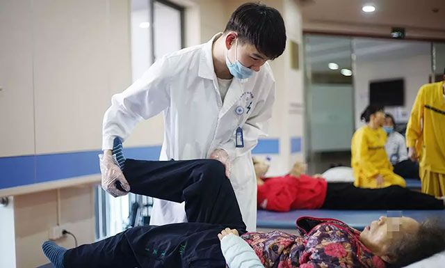 ▲ 康復(fù)技師耐心地為李女士的母親活動(dòng)腿關(guān)節(jié)