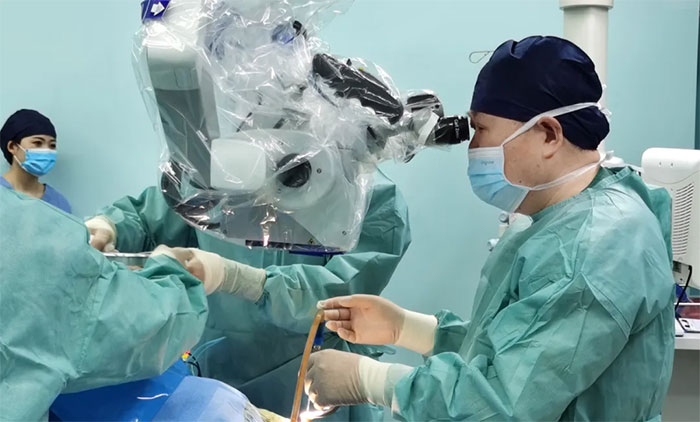 3月1日,經(jīng)過充分的術前準備,并征得家屬同意后,李士其教授正式為劉奶奶行經(jīng)眉弓眶上鎖孔手術。憑借嫻熟的顯微外科手術技巧,豐富的手術經(jīng)驗,熟練的顯微神經(jīng)解剖,在充分保護好海綿竇、頸內(nèi)動脈、視神經(jīng)等結(jié)構前提下,李士其教授在錯綜復雜的神經(jīng)血管狹窄間隙中,逐步分塊切除腫物,仔細刮除腫瘤,最終將腫瘤全部切除,手術順利完成。