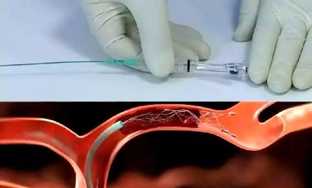 介入取栓是通過大腿2mm切口將取栓支架送進血管,到達血栓位置將血栓移除,從而實現(xiàn)血管再通。如果堵得不嚴重,就能用藥物化開,可堵得非常嚴重,藥物的效果就達不到了,所以必須把堵塞物去除才能恢復暢通。