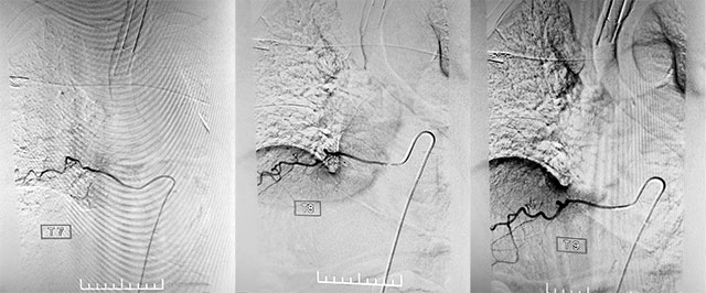 為了定位病灶,3月16日下午1點(diǎn),在復(fù)合手術(shù)室,張琪博士在劉春醫(yī)生、周林華醫(yī)生協(xié)助下通過股動(dòng)脈穿刺術(shù)將造影劑推入各個(gè)脊髓間動(dòng)脈。需要一條動(dòng)脈一條動(dòng)脈的試,并且脊髓間動(dòng)脈復(fù)雜,需要非常細(xì)致的手法,十分考驗(yàn)醫(yī)生的細(xì)心與耐心。經(jīng)過兩個(gè)多小時(shí)的連續(xù)造影,終于在T8右側(cè)肋間動(dòng)脈發(fā)現(xiàn)瘺口。“造影提示,該處瘺口由肋間動(dòng)脈供血至硬脊膜靜脈,脊髓引流靜脈迂曲擴(kuò)張明顯。”張琪博士解釋道。