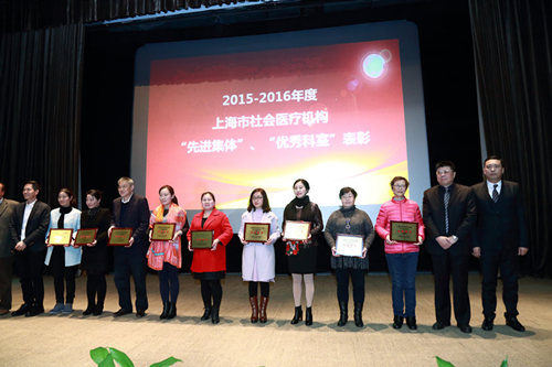 李魯萍主任(右三)領(lǐng)取上海市社會(huì)醫(yī)療機(jī)構(gòu)2015~2016年度“優(yōu)秀科室”牌匾