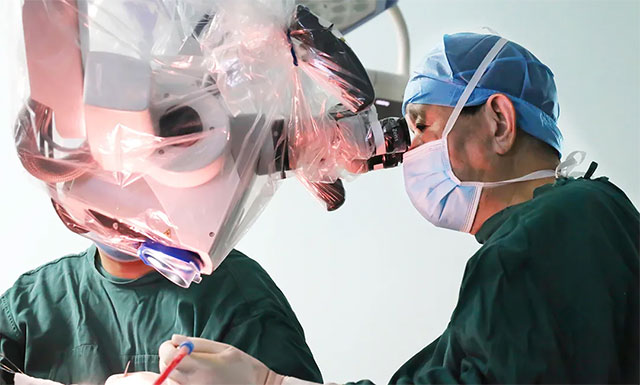 ▲借助蔡司顯微鏡(雙熒光),沈教授進(jìn)行手術(shù)