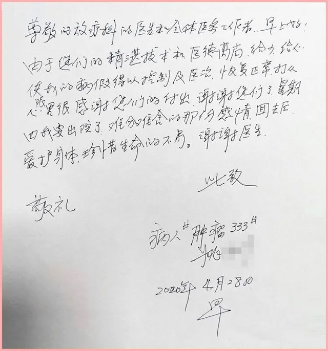 “由于您們的精湛技術(shù)和醫(yī)德高尚,給力、給心,使我的病情得以控制及醫(yī)治,恢復(fù)正常,打心眼里很感謝您們的付出,謝謝您們了!星期四我就要出院了,難分難舍的那份感情,回去后,我會愛護身體,珍惜生命的不易……”