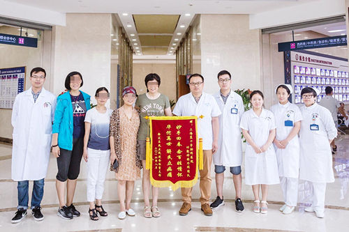 周鹿敏(左5)代摯友送錦旗感謝醫(yī)院的技術(shù)與服務(wù)