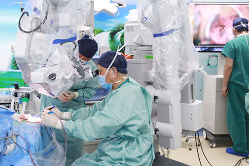 通過3D成像系統(tǒng),能看到手術(shù)全程,圖為沈教授在為倩倩進行手術(shù)