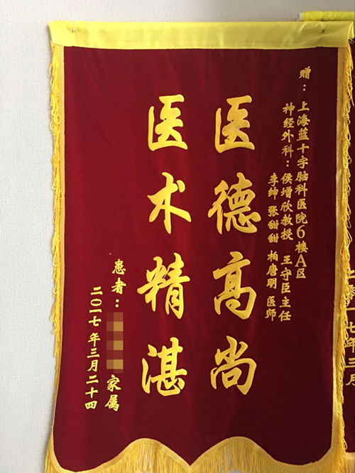 亮亮父母給侯增欣主任贈送的錦旗已掛在了錦旗墻