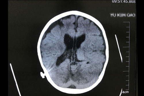 亮亮正式出院三個月后復(fù)查CT影像顯示:慢性中度以上阻塞性腦積水,腦室分流術(shù)后改變