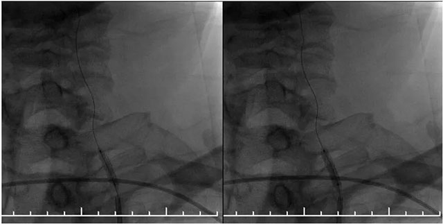 ▲ 藥物洗脫球囊在微導(dǎo)絲導(dǎo)引下到位于左側(cè)椎動脈支架內(nèi),充分?jǐn)U張藥物球囊使其貼壁