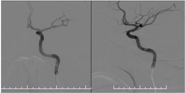 術(shù)中,張琪博士在劉春醫(yī)生、周林華醫(yī)生及醫(yī)護團隊協(xié)助下從左側(cè)股動脈穿刺,置入6F導(dǎo)管鞘。將6F導(dǎo)引導(dǎo)管在泥鰍導(dǎo)絲導(dǎo)引下置入左側(cè)頸內(nèi)動脈,造影明確巖骨段狹窄呈,測量狹窄段長度及近遠端血管支架,選擇合適支架,隨后在微導(dǎo)絲輔助下越過狹窄段超選至C6段,選用4.0*18球擴支架,沿微導(dǎo)絲到位狹窄段,球囊擴張至6atm,即刻釋放支架,即刻造影見狹窄明顯改善,支架貼壁良好,血流通暢,狹窄段完全覆蓋。
