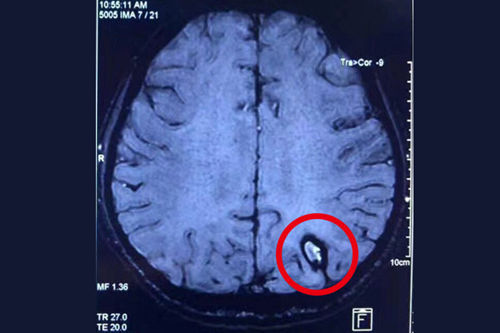 患者術(shù)前的磁共振影像: 紅圈處為顱內(nèi)海綿狀血管瘤病灶