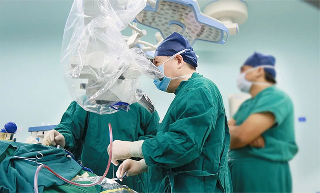 在制定詳細(xì)手術(shù)方案并充分完善術(shù)前準(zhǔn)備后,7月24日,李士其教授在吳治群博士、黃秀夫醫(yī)生協(xié)助下經(jīng)蝶竇入路成功為患者進(jìn)行了手術(shù)。術(shù)中,在蔡司顯微鏡(雙熒光)下,見淡紅色腫物,質(zhì)軟,其外有包膜覆蓋。李士其教授在充分保護(hù)好海綿竇、頸內(nèi)動脈、視神經(jīng)等結(jié)構(gòu)前提下,將鞍內(nèi)可見腫瘤全部切除,并留取腫瘤送檢病理。手術(shù)順利完成,術(shù)中只失血約10毫升。