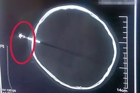 紅圈處為高密度引流管,進(jìn)入顱內(nèi)約1.2厘米,后部為放射狀偽影