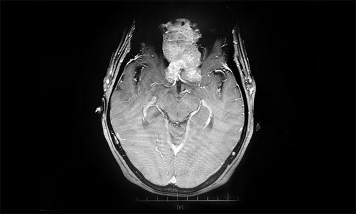 ▲ 通過(guò)增強(qiáng)磁共振影像,可見(jiàn)前顱底嗅溝腦膜瘤,體積巨大