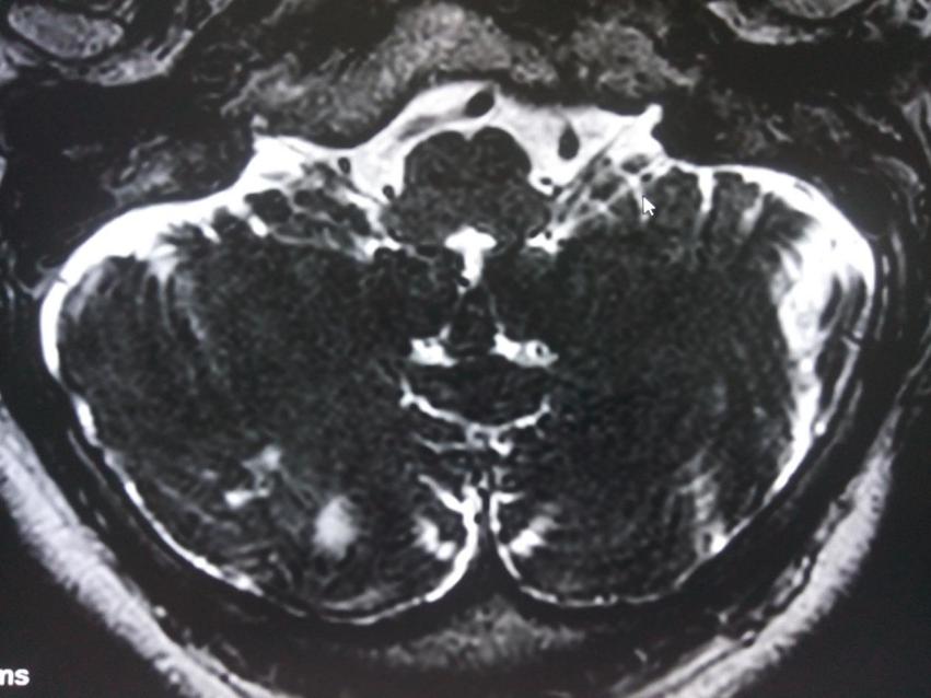61歲女性,主因刺激性咳嗽伴左側(cè)咽喉部間斷性疼痛2年入院,入院后追問其疼痛性質(zhì)為突發(fā)突止的放電樣劇痛,疼痛位于咽后壁,影響進(jìn)食,近1月來干咳頻繁,完善相關(guān)檢查后行左側(cè)舌咽神經(jīng)微血管減壓術(shù),術(shù)后上述癥狀消失。入院后頭部影像學(xué)檢查如下: