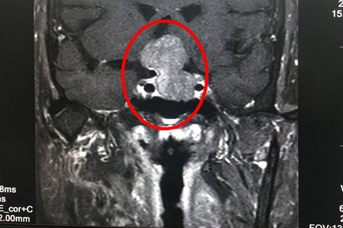 術(shù)前核磁共振顯示:垂體巨大腺瘤(畫圈部分)