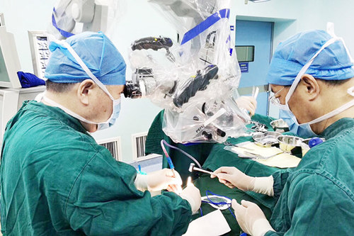 潘仁龍教授在德國蔡司雙熒光顯微鏡的下進行精密手術(shù)