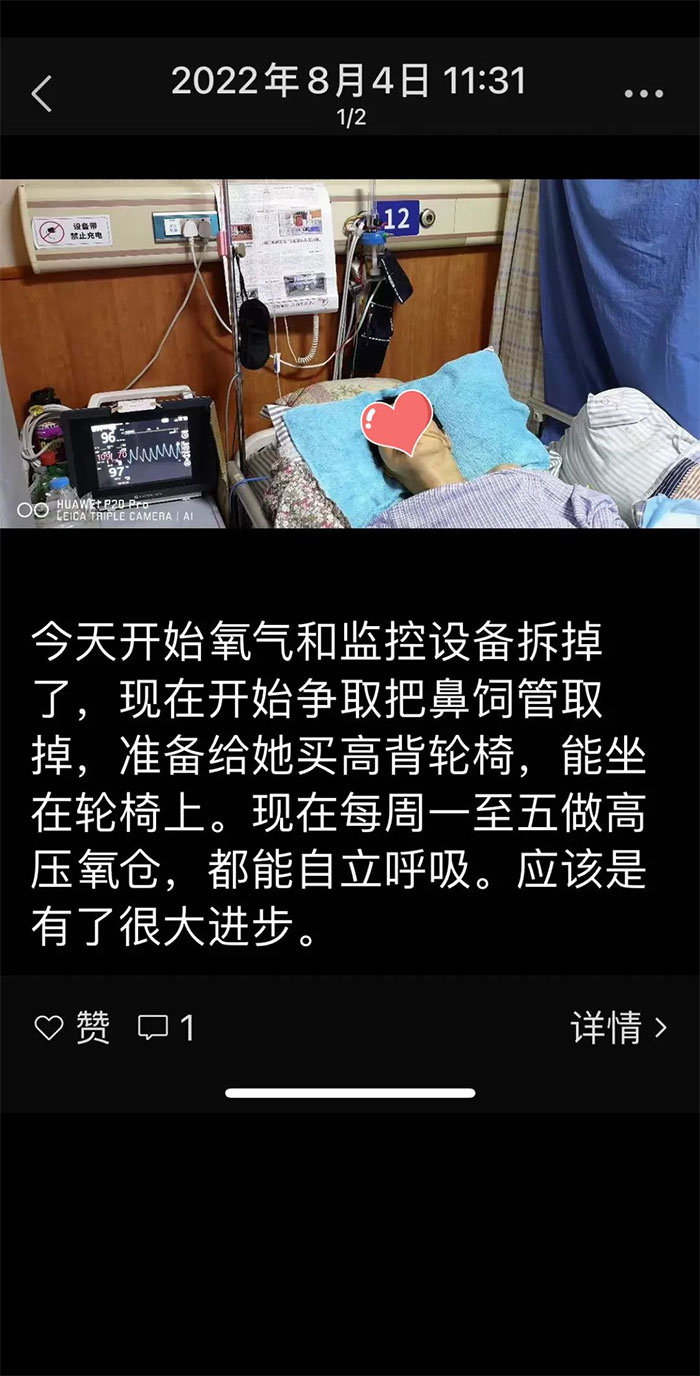 成功封管后的韓女士,迅速轉(zhuǎn)入病情好轉(zhuǎn)“快車道”。如今,她的肺部感染已完全控制,神志逐漸清醒,能簡單完成不少指令性動作。偶爾韓老師也會坐上輪椅,在病區(qū)走廊短暫活動,開心的她總是不忘與偶遇的病友揮手招呼。