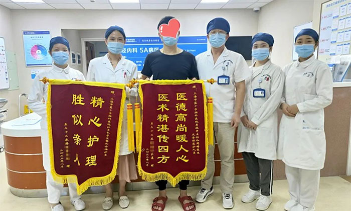 縈繞心頭的黑色陰霾終于散盡,眼見著韓老師一天比一天更好,家屬難掩心中的激動。8月底,為了感謝5A病區(qū)全體醫(yī)護的優(yōu)質(zhì)醫(yī)療護理,韓老師的家屬特別定制了精美的錦旗,贈予李振并主任和周婷醫(yī)生,以表達長久以來的心中的謝意和敬意。