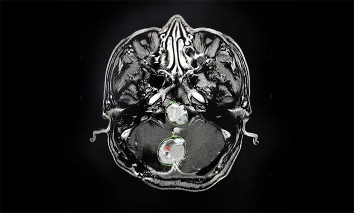 入院后,腫瘤科(放療)頭部伽瑪?shù)督M主任陳琦為他完善了MRI檢查,明確多處腫瘤的位置、體積(單體腫瘤最大直徑約2.7cm)。經(jīng)與神經(jīng)外科、醫(yī)學(xué)影像科等開展MDT多學(xué)科聯(lián)合會(huì)診,評(píng)估復(fù)發(fā)腫瘤病灶毗鄰腦干等重要功能區(qū),手術(shù)難度高、風(fēng)險(xiǎn)大,可通過頭部伽瑪?shù)吨委煟刂颇[瘤生長(zhǎng),快速緩解臨床癥狀。