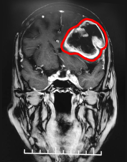 ▲MRI影像顯示,患者左腦有一個(gè)大小約5.8*5.6cm的腫瘤