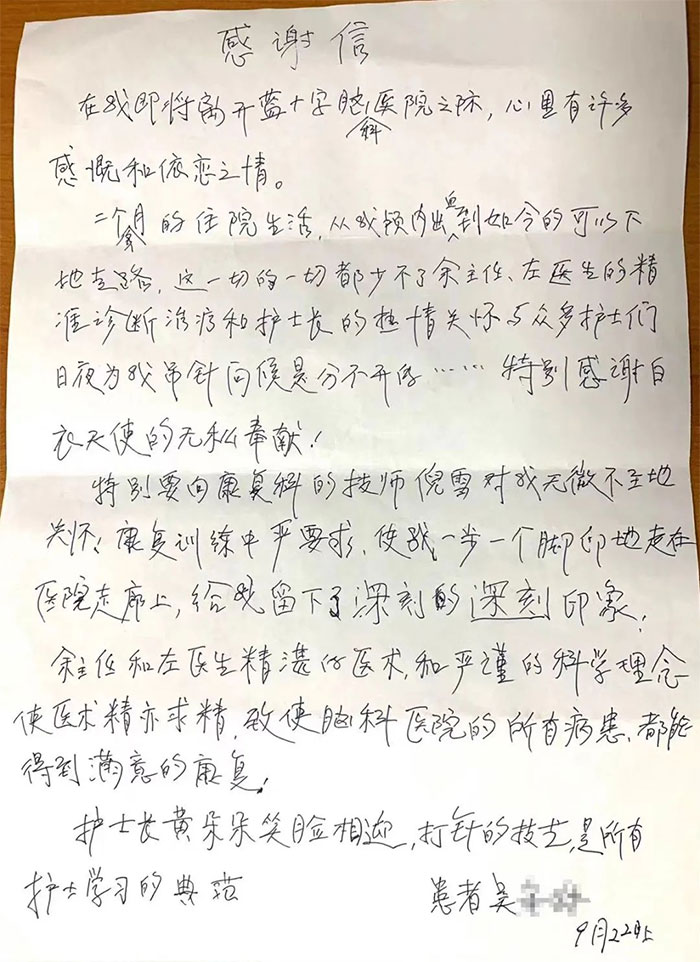 二個多月的住院生活,從我顱內(nèi)出血到如今可以下地走路,這一切的一切都少不了余主任、左醫(yī)生的精準(zhǔn)診斷治療和護(hù)士長的熱情關(guān)懷與眾多護(hù)士們?nèi)找篂槲业踽槅柡蚴欠植婚_的……特別感謝白衣天使的無私奉獻(xiàn)!