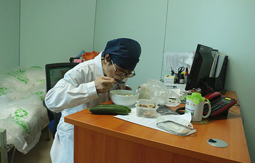 早上6:30到科室,將23位患者的情況查看一遍,審查病人的病歷、用藥及化驗(yàn),核對(duì)化驗(yàn)單,進(jìn)行用藥調(diào)整,交代管床護(hù)士注意事項(xiàng),8:00為10多位昏迷患者扎頭針,9:30做纖支鏡治療安排,下午13:00花半個(gè)小時(shí)匆忙吃一頓簡(jiǎn)單的午餐,14:00趕到神經(jīng)內(nèi)科為一位帕金森綜合征、反復(fù)高熱患者會(huì)診,15:30家屬探訪,和家屬溝通、解答疑慮,16:30繼續(xù)纖支鏡治療,19:00應(yīng)家屬要求,利用下班時(shí)間到神經(jīng)外科給一名車禍腦外傷昏迷2年的患者和一名腦血管痙攣破裂昏迷患者扎頭針、做推拿......一般晚上7、8點(diǎn)回家,有時(shí)9、10點(diǎn)甚至不回家。
