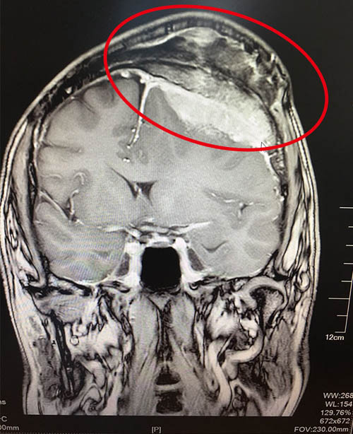 術前核磁顯示:左側額部(大腦凸面)侵襲性腦瘤,侵及顱骨和軟組織