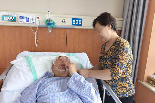 腦瘤手術后,在ICU(重癥監(jiān)護室),家屬為王先生擦拭眼淚