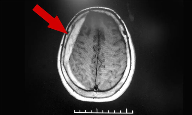 ▲ 術(shù)后,患者硬膜下血腫已被引流清除