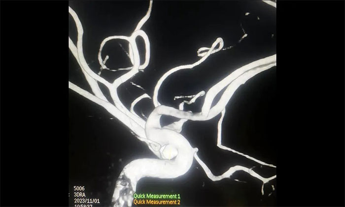 患者收治入院后,孔祥玉醫(yī)生一邊做好疾病科普宣教,一邊安撫患者緊張恐慌的情緒。為盡快明確診斷和制定下一步治療方案,在明確告知風險并獲得患者同意后,由醫(yī)院神經(jīng)外科6A病區(qū)于耀宇主任為患者進行DSA腦血管造影檢查。于主任介紹,顱內(nèi)動脈瘤目前主要通過腦血管CTA、MRA和DSA等血管成像技術(shù)來發(fā)現(xiàn),其中,三維腦血管造影(3D-DSA)是腦血管病精準診斷的“金標準”,可為醫(yī)生判斷動脈瘤所處位置、形態(tài)、大小等提供依據(jù),常用于動脈瘤的最終確診和介入治療。