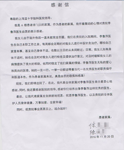 我是6樓患者徐XX的家屬,作為患者的家屬,我懷著激動的心情對貴院李魯萍醫(yī)生由衷地表示感謝。