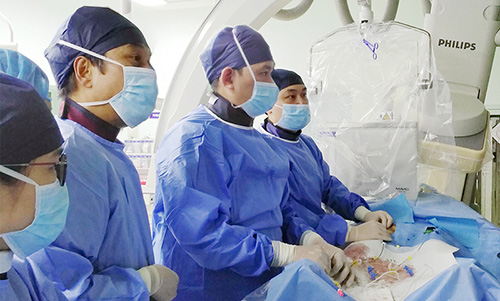 ▲醫(yī)療團(tuán)隊進(jìn)行Tubridge血管重建裝置植入手術(shù)