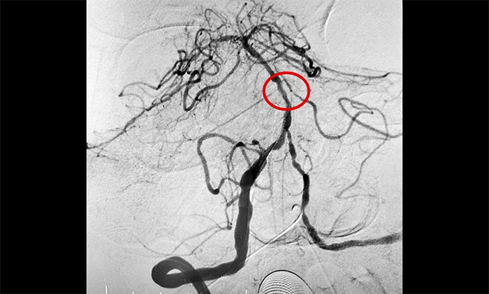席剛明教授充分評估患者的病情及血管情況,本例患者為基底動脈主干病變,呈現(xiàn)為“一線天”樣狹窄,考慮基底動脈重度狹窄為患者再次腦缺血發(fā)作的根源,狹窄處隨時可能形成血栓引發(fā)血管急性閉塞。一旦閉塞,患者將可能出現(xiàn)深昏迷、四肢癱瘓,甚至危及生命,可以說是“命懸一線”,即使僥幸保住性命,大概率也會成為植物狀態(tài)或遺留其他嚴重殘障。